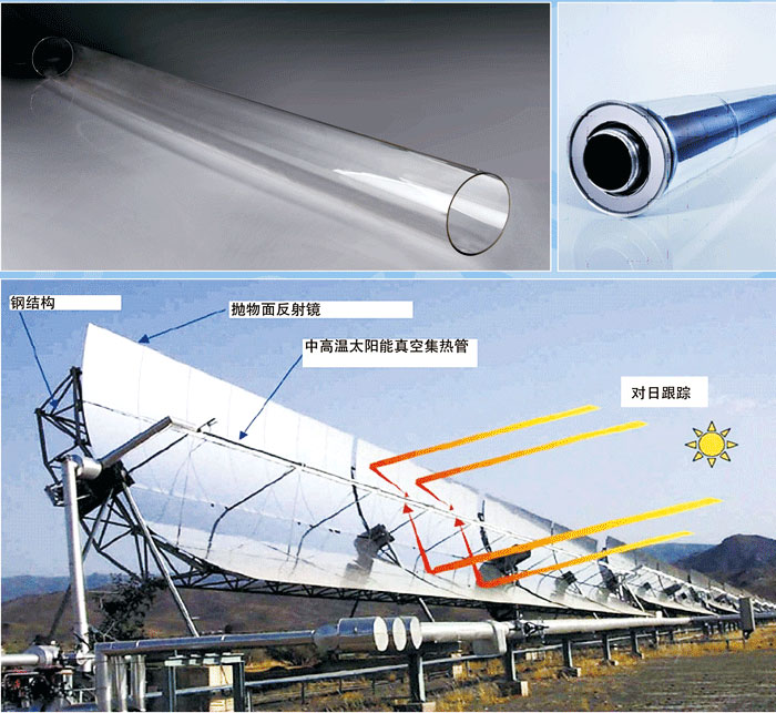 槽式太陽能熱發電系統的核心部分就是聚光集熱系統,而聚光集熱系統的核心部件就是中高溫太陽能真空集熱管。 |