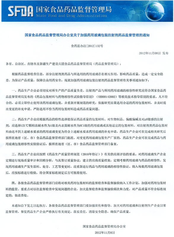 國家食品藥品監(jiān)督管理局辦公室關于加強藥用玻璃包裝注射劑藥品監(jiān)督管理的通知