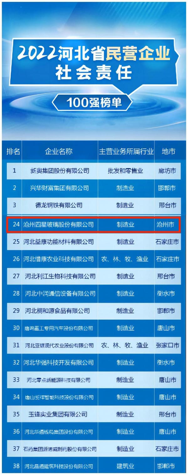 | 滄州四星玻璃入選2022年“河北省民營企業社會責任100強”榜單 |